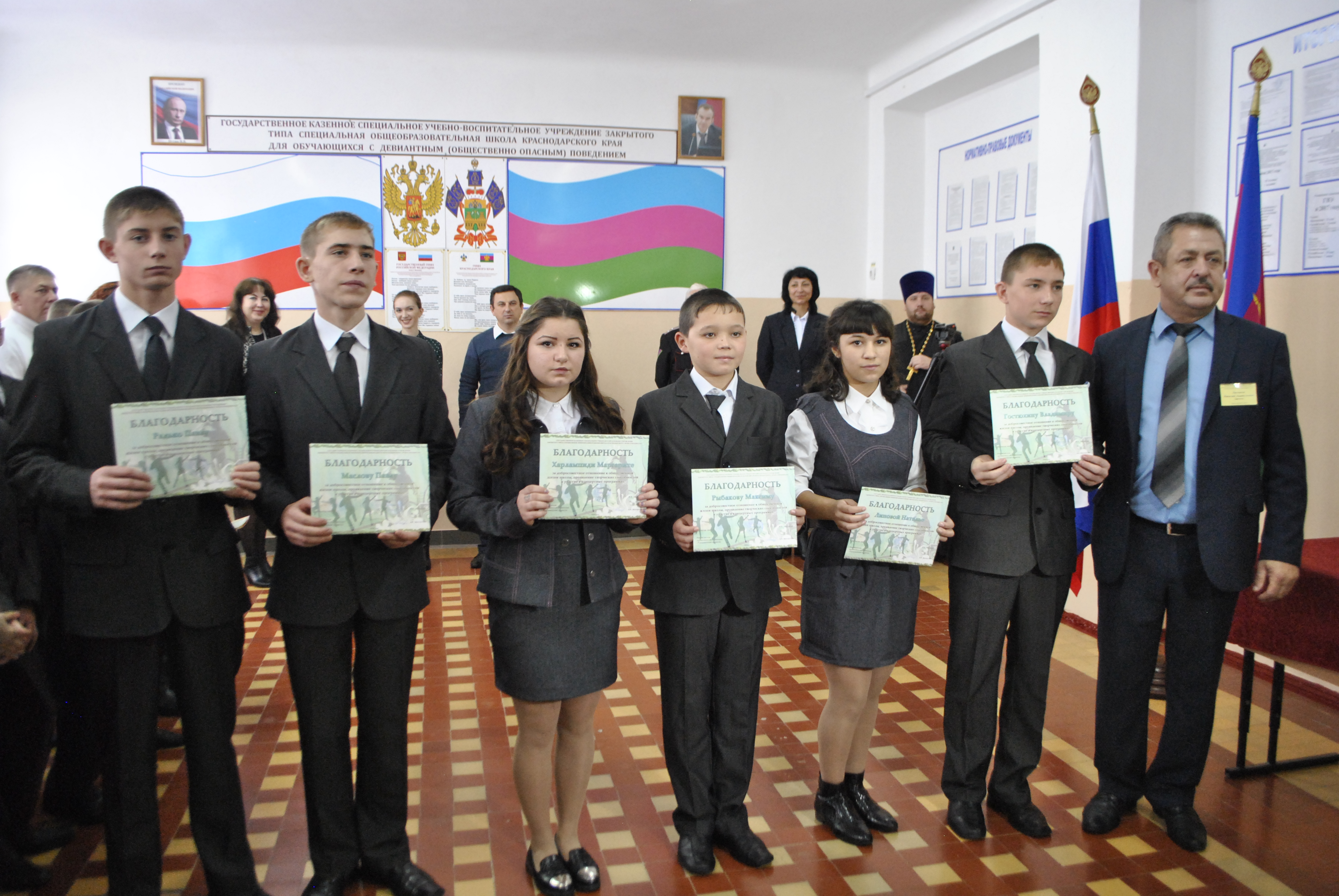 И для выполнения этих поставленных задач коллектива Спецшколы огромную помощь оказывает администрация и министерство образования, науки и молодежной политики Краснодарского края. Мы выражаем им благодарность за внимание и заботу к нашим детям и проведение столь необходимого для них праздника.