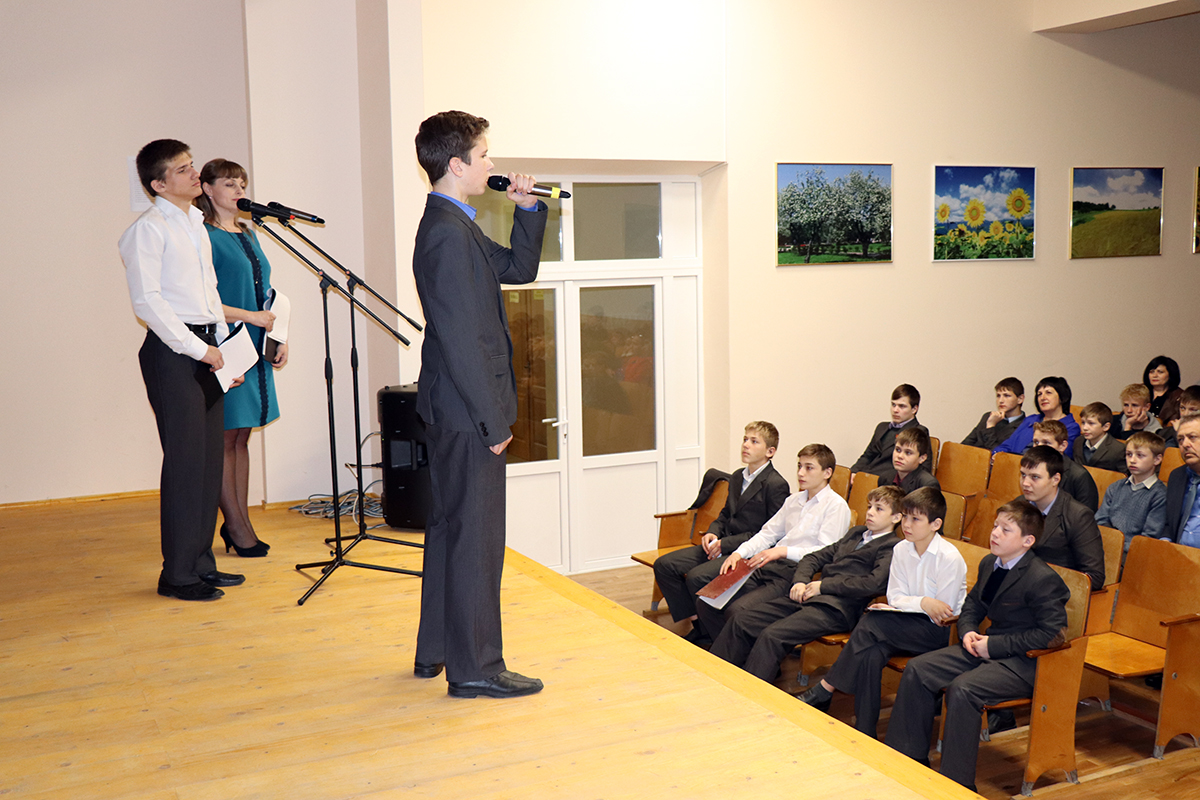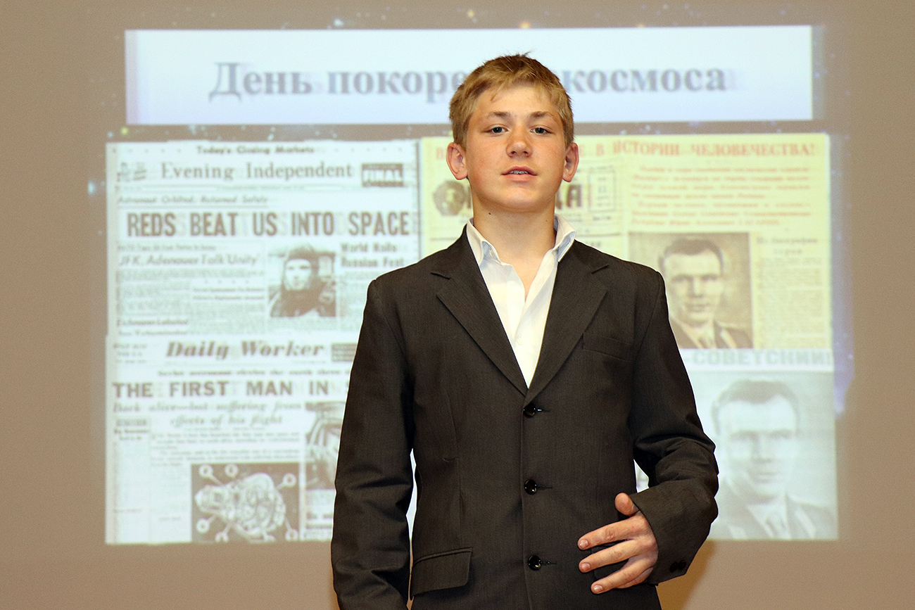 В актовом зале состоялось общешкольное патриотическое мероприятие «Звездам на встречу», на котором с поздравлением к учащимся и коллективу обратился директор школы Николай Анатольевич Лысенков и напомнил имена выдающихся космонавтов Кубани. После чего ведущие Нина Александровна Зиненко и Владислав Маренко рассказали учащимся кратко историю освоения космоса, о выдающихся ученых России, которые стояли у истоков космических полетов, а также о знаменитых на весь мир собаках первопроходцах – Белке и Стрелке. И напомнили детям о том, какой фурор произвела новость о первом полете человека в космос. Об основателях космонавтики рассказали учащиеся Артем Кирсанов и Григорий Муратов. Для зрителей в зале прозвучала всем известная песня «Зеленая трава» в исполнении Вениамина Барбоя, которую дружно подпевал весь зал. Кроме того, с отрывком из стихотворения «Поле бессмертия» выступил Игорь Гороховцев. В рамках программы дети посмотрели видеоролики из новостных архивов «Гагарин совершает первый в истории полет в космос», «Белка и Стрелка» и «Скоро каждый сможет полететь в космос».