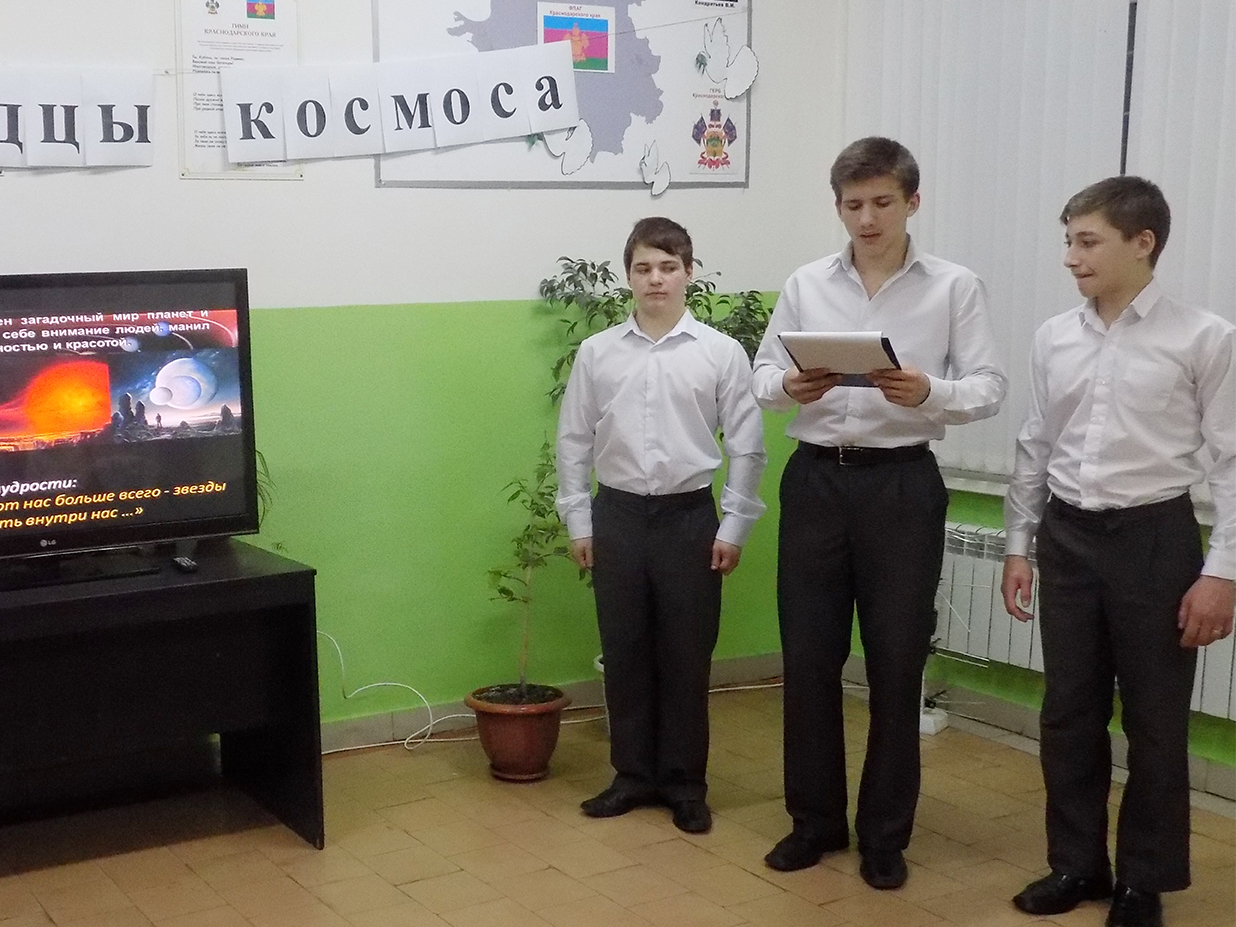Познавательный час был посвящен истории освоения космоса. В рамках программы мероприятия, ведущие Георгий Параконный и Владислав Моренко познакомили сверстников с знаменитыми учеными и конструкторами в области космонавтики и первыми космонавтами планеты. В ходе мероприятия звучали стихотворения, демонстрировались слайды и видеоклипы о достижении в области космонавтики.