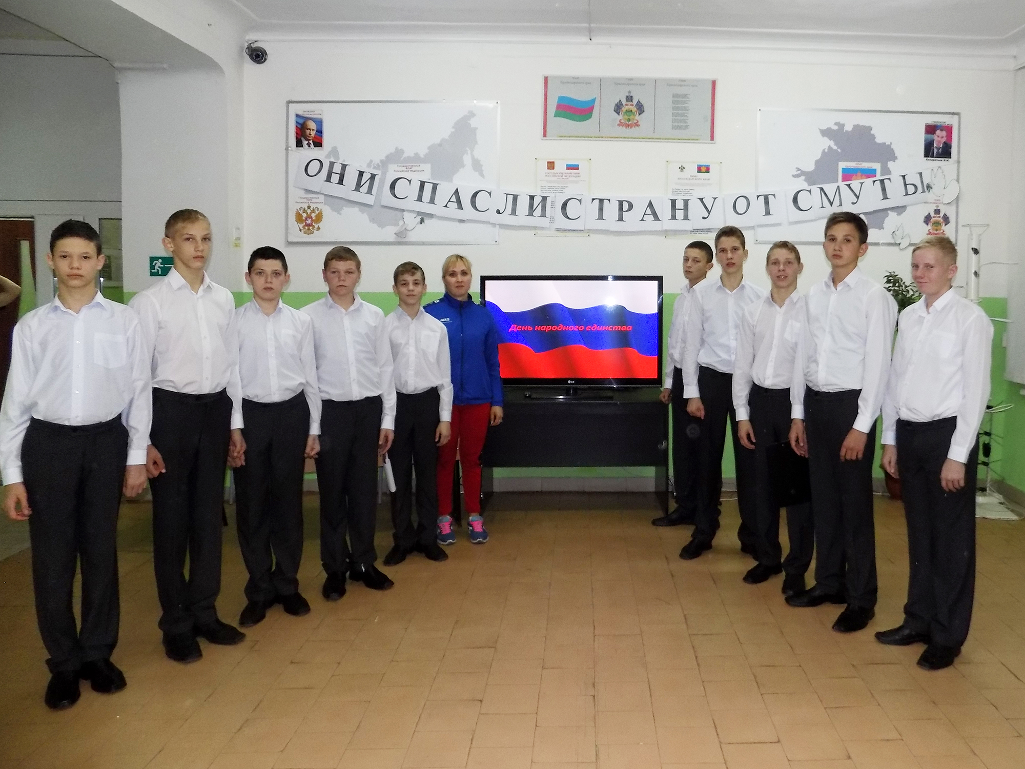 Вечером в фойе спального корпуса прошло общешкольное патриотическое мероприятие «Они спасли страну от смуты». Исторический час подготовила и провела воспитатель Наталья Григорьевна Коломиец, с целью духовно-нравственного и патриотического воспитания обучающихся. Здесь ведущие Вениамин Барбой и Павел Тыликов напомнили детям о истории праздника, событиях 1612 года и о героическом подвиге нашего народа под предводительством Минина и Пожарского. Для мероприятия была подготовлена мультимедийная презентация и тематические видеофильмы о истории народного ополчения.
