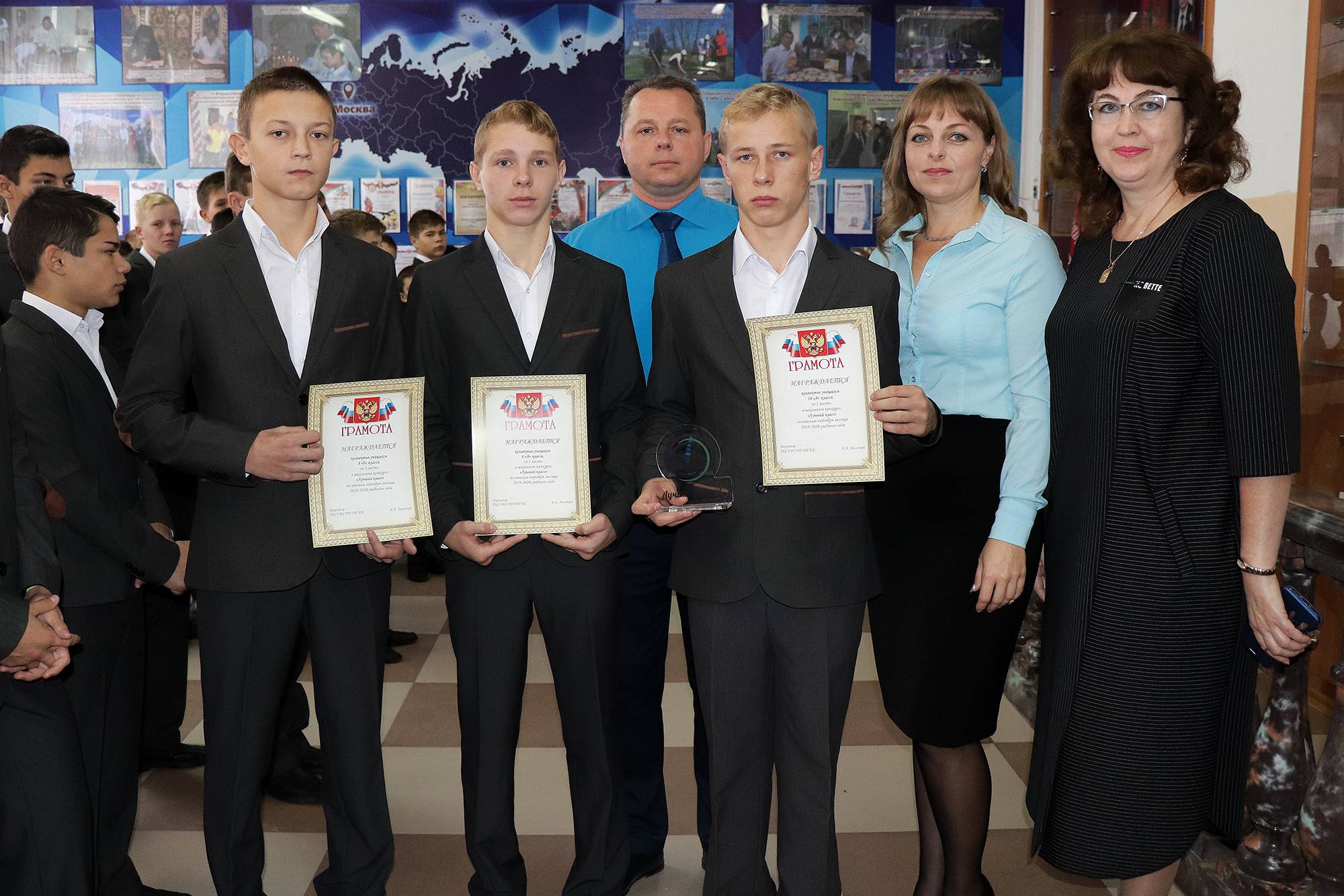 Завершением торжественной части стало награждение победителей и призеров школьных конкурсов «Лучший класс» и «Лучший ученик» за октябрь месяц 2019-2020 учебного года. Заместитель директора по ВР А.В. Базарный вручил Дипломы и Кубки обучающимся школы. В номинации «Лучший класс» победил коллектив учащихся 10 «А» класса, классный руководитель Светлана Юрьевна Бугайкова, воспитатели Лидия Владимировна Танкевич, Антон Владимирович Каракуца. 2 место в конкурсе занял коллектив учащихся 8 «А» класса, классный руководитель Елена Владиленовна Деревянко, воспитатели Наталья Григорьевна Коломиец, Ольга Алексеевна Касьянова. 3 место занял коллектив учащихся 8 «Б» класса, классный руководитель Нина Александровна Зиненко, воспитатели Наталья Григорьевна Коломиец, Ольга Алексеевна Касьянова.