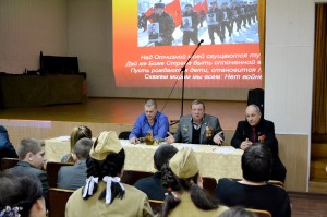 13 февраля в канун Дня памяти о россиянах, исполнявших долг за пределами Отечества, прошел общешкольный классный час «Живая память!» с приглашение участников боевых действий в Афганистане и Чеченской республике. На мероприятие присутствовали Анатолий Анатольевич Пальваль - подполковник запаса, ветеран боевых действий в Афганистане и Чечне; Сергей Александрович Байраков – офицер запаса, участник Афганской войны ветеран вооруженных сил РФ; Виталий Николаевич Шрамченко – участник боевых действий в Чечне, ветеран вооруженных сил РФ.